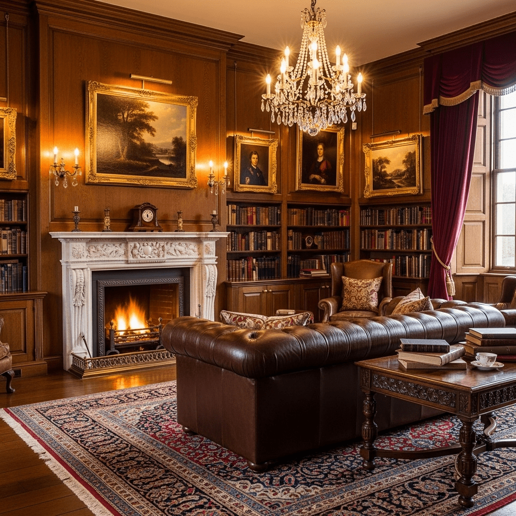 Traditional elegance meets lived-in luxury with leather Chesterfield sofas, wood-paneled walls, and Persian rugs. Built-in bookcases and a grand fireplace anchor this timeless design.