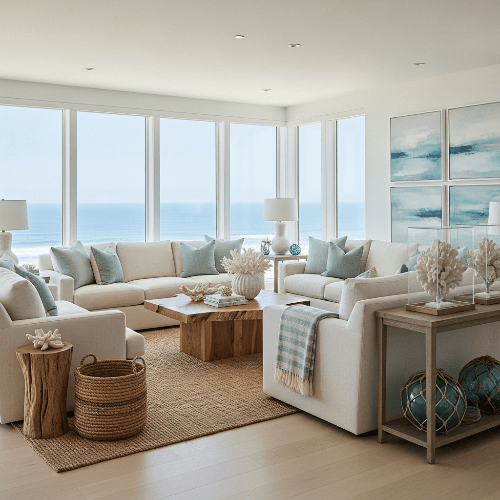 Sophisticated beach house style with high-end finishes—think white oak floors, linen upholstery, and driftwood accents paired with marble and brass. Ocean views enhance the serene luxury.