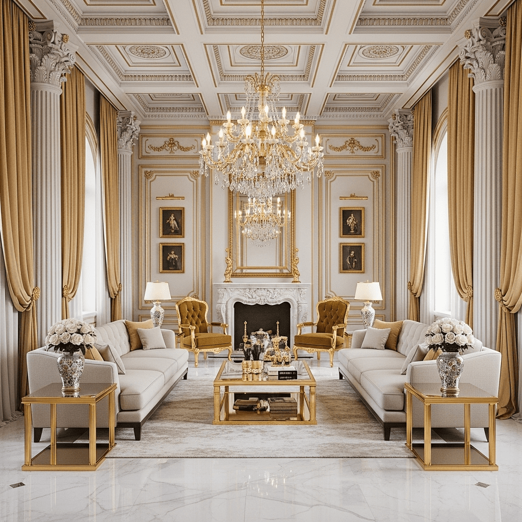 Symmetry, columns, and classical proportions create palatial elegance. White and gold color schemes, marble surfaces, and crystal chandeliers evoke European palaces with modern comfort.
