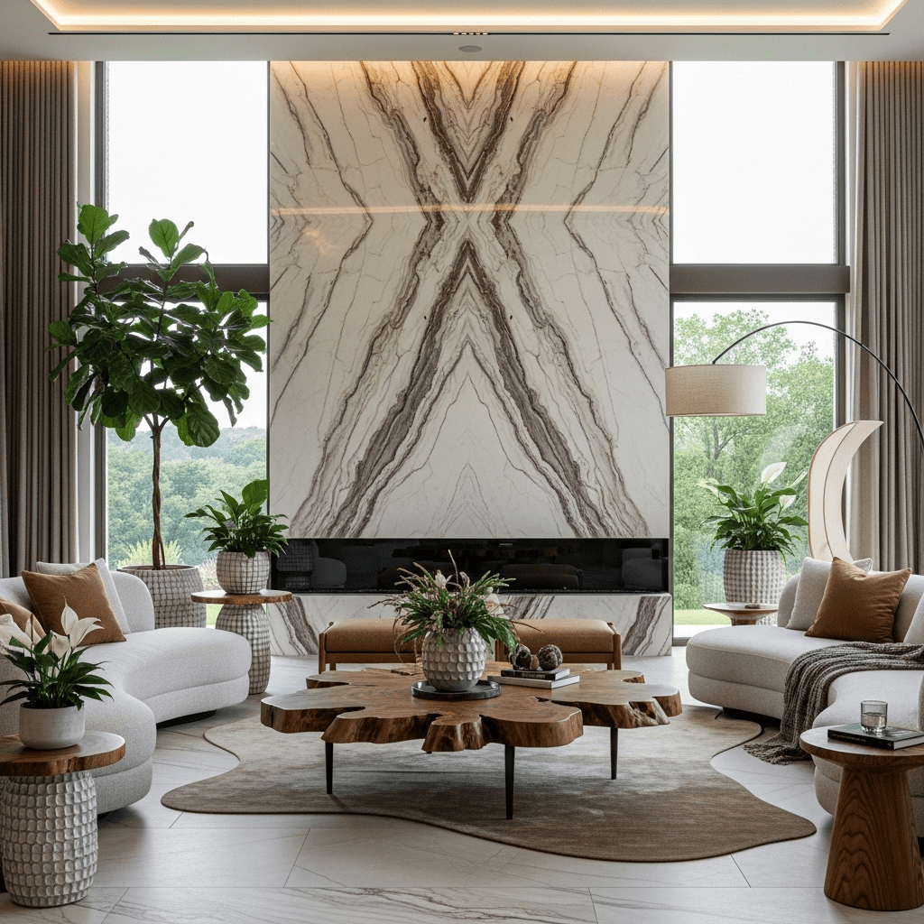 Natural materials elevated to luxury status—book-matched marble, live-edge wood, and organic shapes create sophisticated earthiness. Neutral tones and biophilic design elements bring nature inside elegantly.