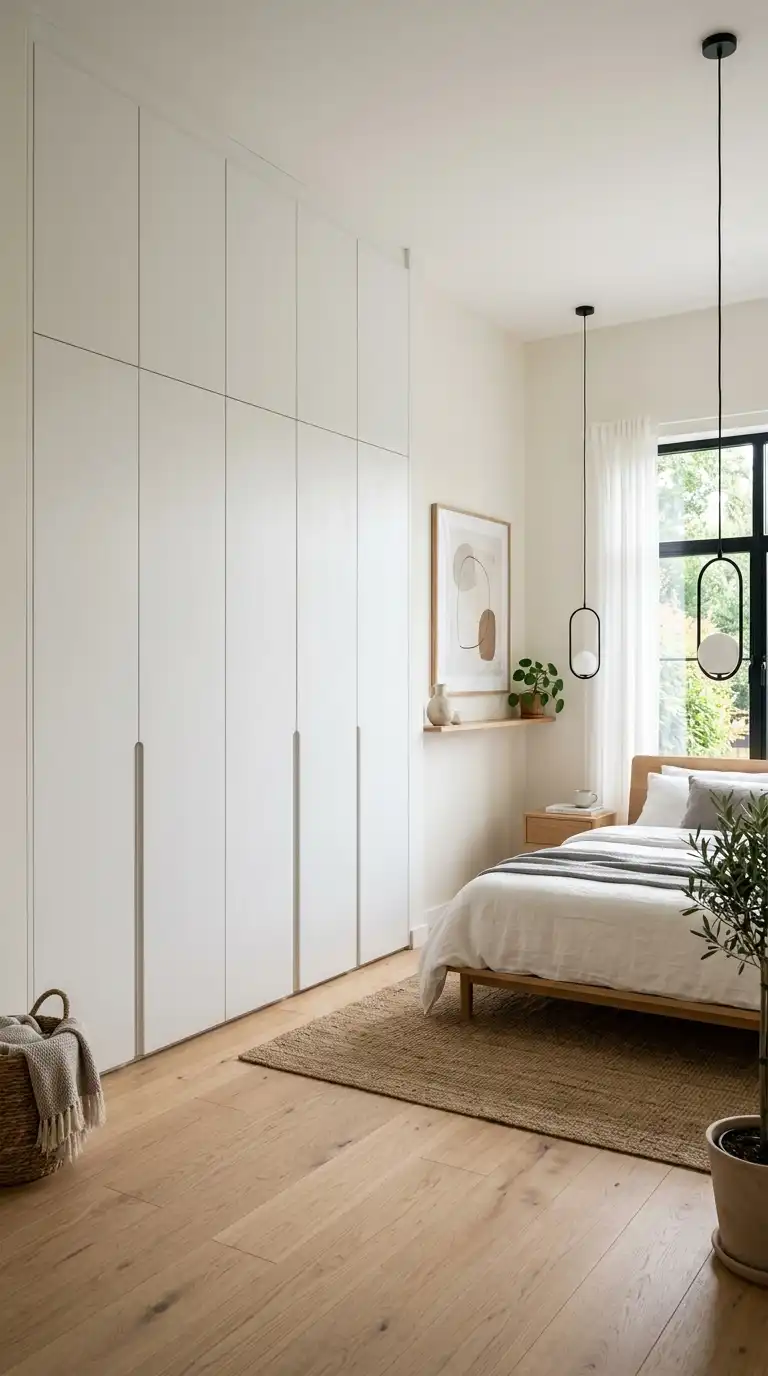 The handleless floor-to-ceiling wardrobe is the quintessential modern storage solution. Without visible hardware, the doors create a seamless, uninterrupted surface that blends quietly into the architecture of the room. Push-to-open mechanisms or integrated grooves allow doors to open without protruding handles, maintaining the clean aesthetic. The floor-to-ceiling design maximizes vertical storage while eliminating the gap above traditional wardrobes, drawing the eye upward and making the room feel taller. Choose matte finishes in neutral tones—soft white, warm gray, or charcoal—to enhance the sense of calm and simplicity.
