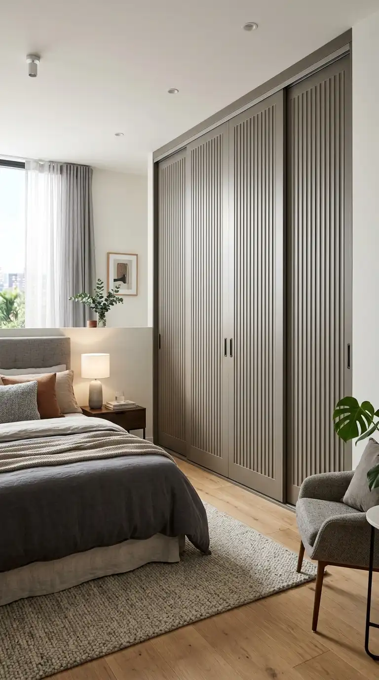 Fluted or ribbed panels add texture and architectural interest to sliding wardrobe doors. The vertical grooves create rhythm and depth, catching light and casting subtle shadows that change throughout the day. This detailing transforms a simple wardrobe into a design feature, adding visual richness without overwhelming the space. Fluted panels work beautifully in modern, transitional, and eclectic interiors. Choose a matte finish to emphasize the texture, and pair with minimal hardware—or no hardware at all—to let the fluted pattern take center stage.