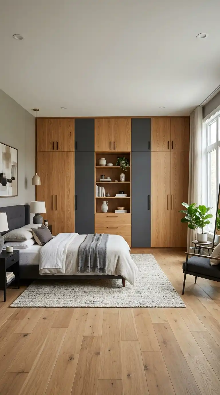 Two-tone wardrobes add visual interest and personality by combining two complementary finishes within a single design. Popular combinations include light wood with matte white, dark wood with high-gloss gray, or matte black with natural oak. Use one finish for the main structure and another for door panels, or create a horizontal division that defines different storage zones. This approach breaks up large expanses of cabinetry and creates a custom, designer look that feels unique and intentional. The contrasting finishes also allow you to incorporate both warm and cool tones in a cohesive way.