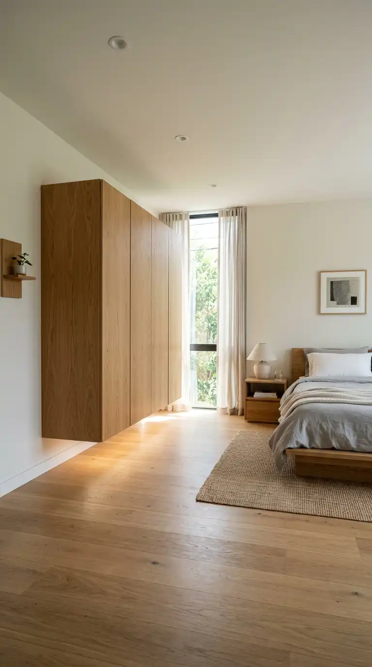 A floating wardrobe mounted off the floor creates a sense of lightness and space in a modern bedroom. The gap between the wardrobe and the floor allows light to pass underneath, making the room feel larger and more open. This design works particularly well in minimalist and Scandinavian interiors, where clean lines and simplicity are key. Use concealed brackets or a wall-mounted rail system to achieve the floating effect, and choose a finish that complements your wall color for a seamless appearance. Add under-cabinet lighting to enhance the floating illusion.