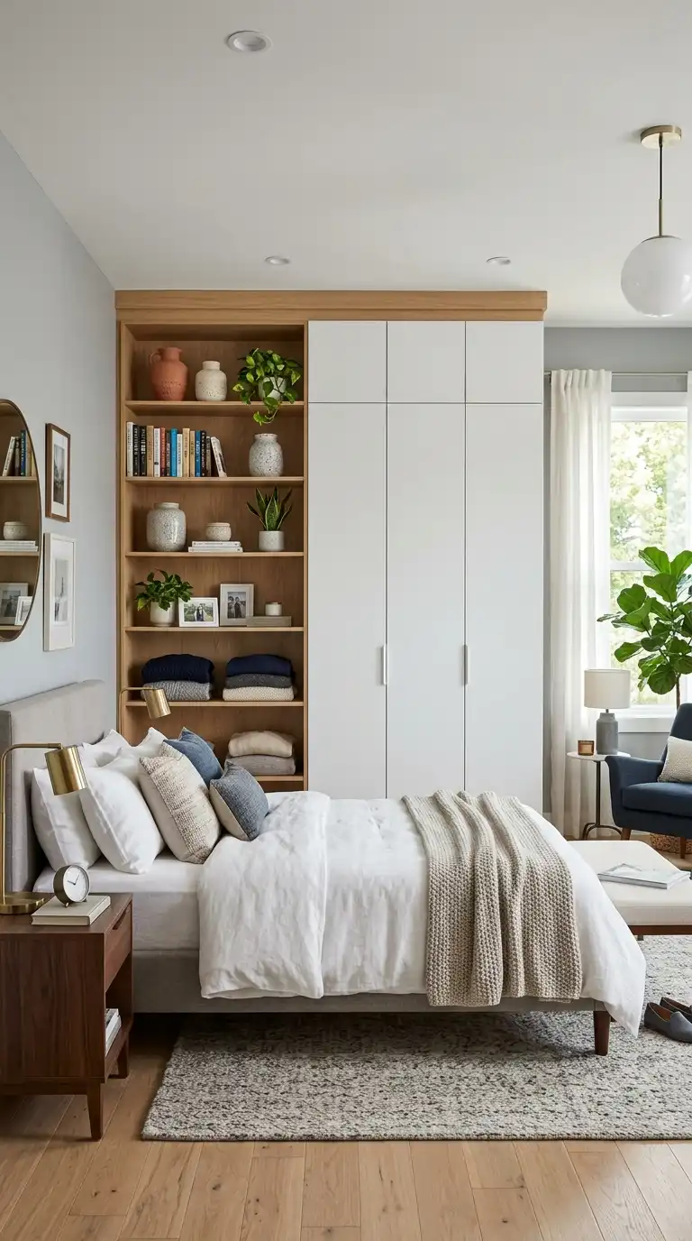 Combine open shelving with closed cabinets in a single wardrobe design for a balanced mix of display and concealment. Use open sections to showcase accessories, books, or folded knitwear, while closed sections hide everyday clothing and less visually appealing items. This approach creates visual interest and prevents the wardrobe from feeling too monolithic. Position open sections at eye level for easy access and display, and use closed storage above and below. The mix of open and closed storage adds rhythm and variety to the design.
