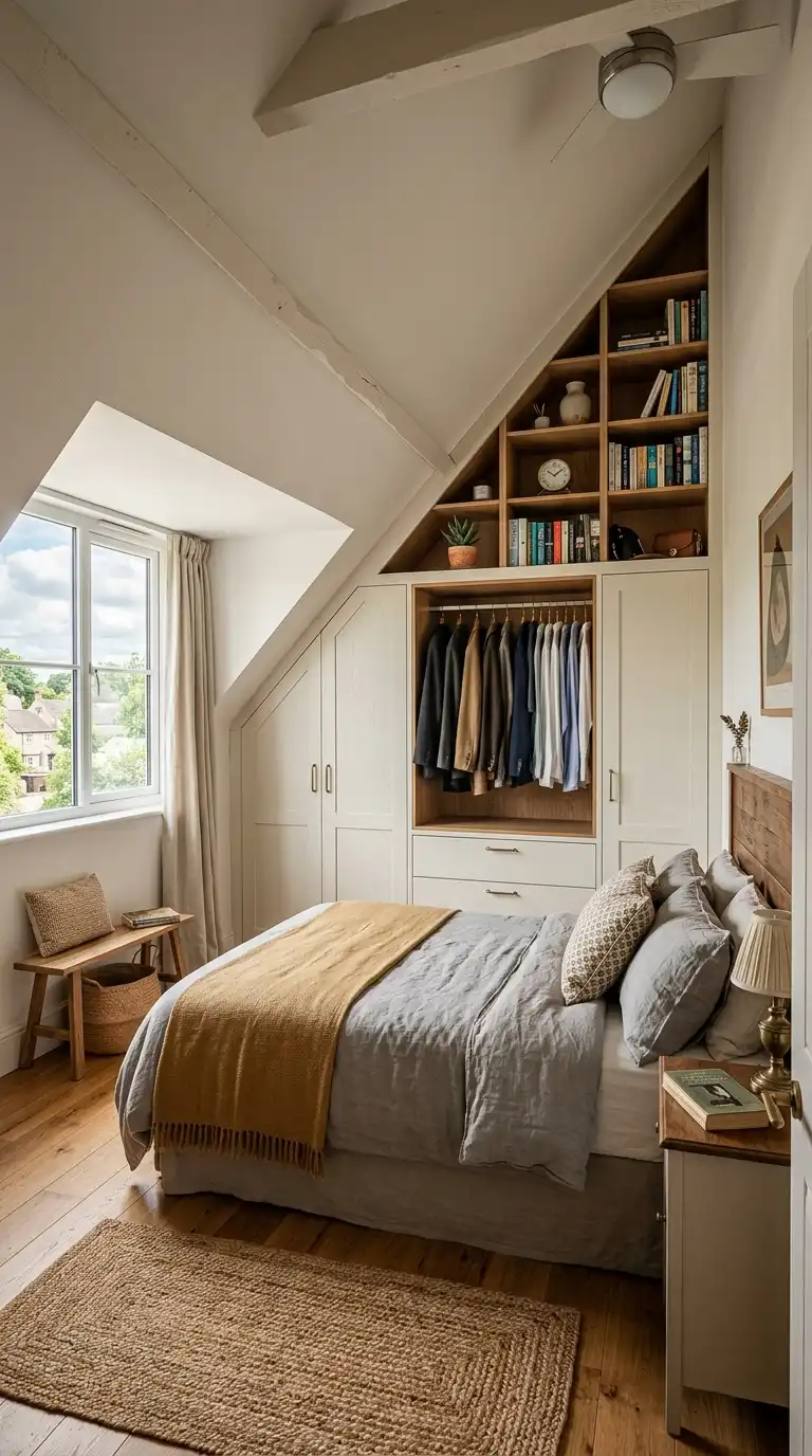 A wardrobe with a slanted or angled top adds architectural interest and can help integrate storage into rooms with sloped ceilings or irregular architecture. This design is ideal for attic bedrooms, loft spaces, or rooms where a traditional rectangular wardrobe would create awkward gaps. Custom-built to follow the line of the ceiling, the slanted top creates a seamless, built-in appearance that maximizes storage in challenging spaces. Use the lower sections for hanging clothes and the angled top for shelving or seasonal storage.