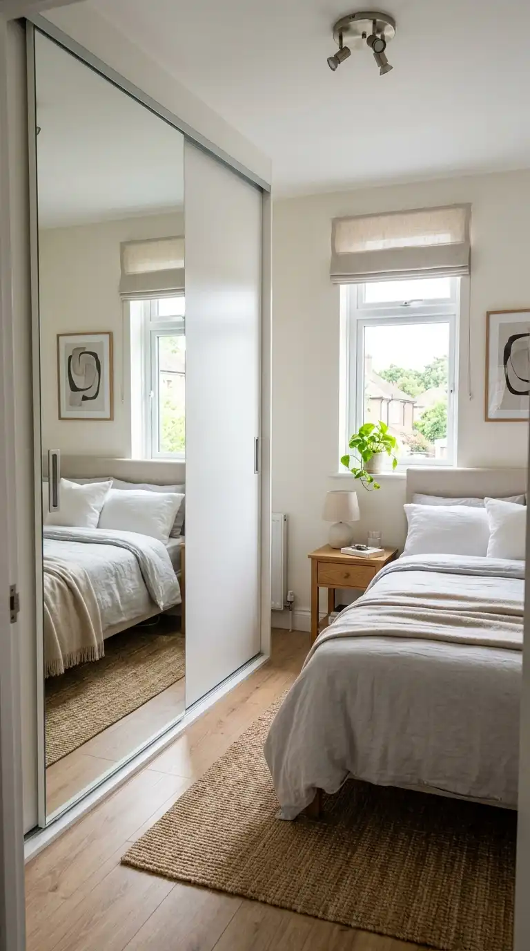 Mirrored wardrobe panels serve both practical and spatial purposes in modern bedrooms. A full-length mirror integrated into a sliding or hinged door eliminates the need for a separate mirror, reducing visual clutter. The reflective surface also bounces light around the room, making the space feel larger and brighter. For a minimalist approach, choose frameless mirrors or those with slim, discreet edges. Position mirrored panels strategically to reflect natural light from windows, enhancing the sense of openness without adding decorative elements.