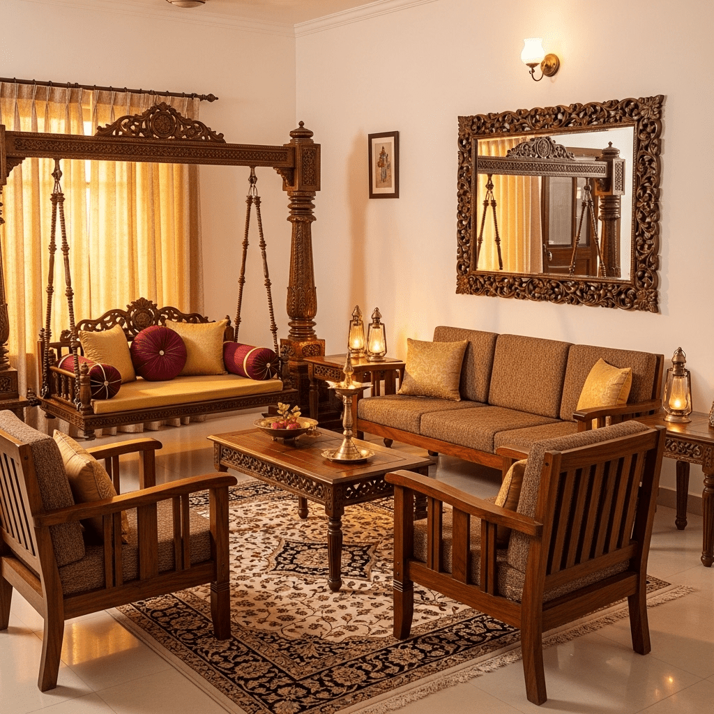 A classic Indian element where a beautifully carved wooden swing (Jhoola) serves as additional seating. It adds a sense of nostalgia and movement to the room.