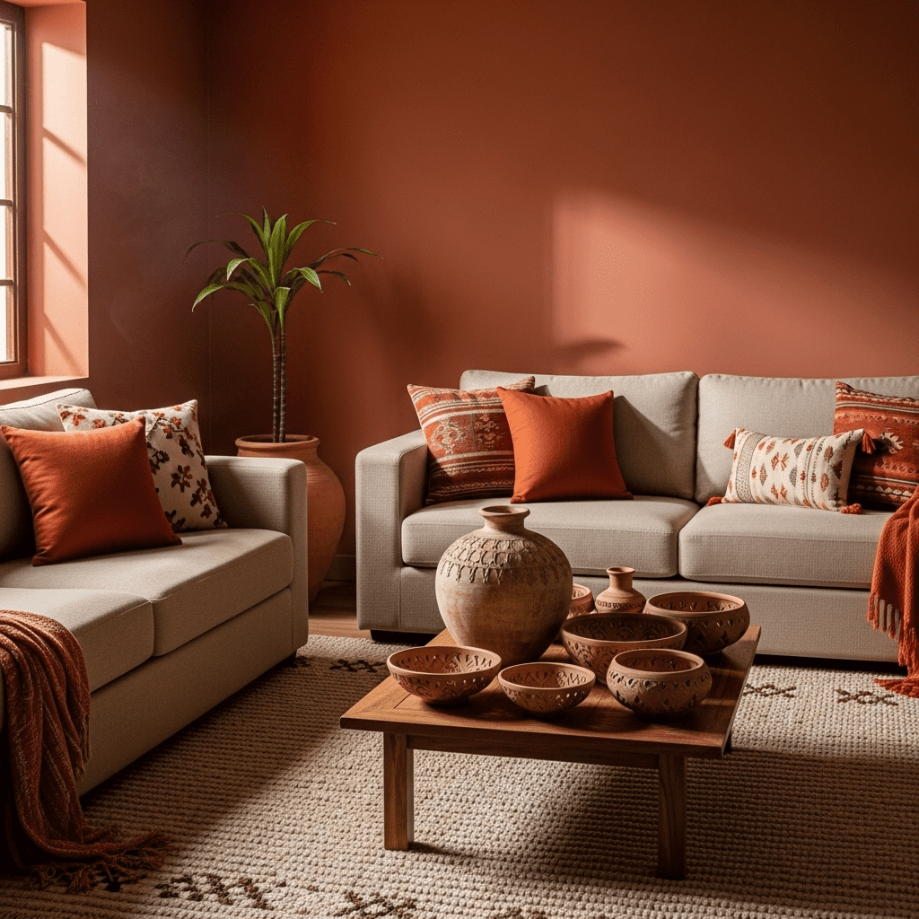 Using warm clay tones, burnt oranges, and deep yellows inspired by Indian spices and soil. This creates a grounded, sun-drenched feel.