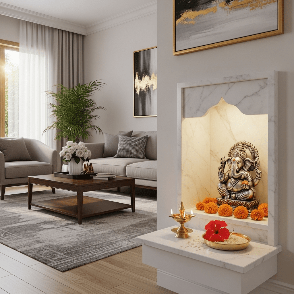 A design that seamlessly integrates a small, elegant prayer unit (Mandir) into the living room layout using backlit marble or intricate wood latticework.