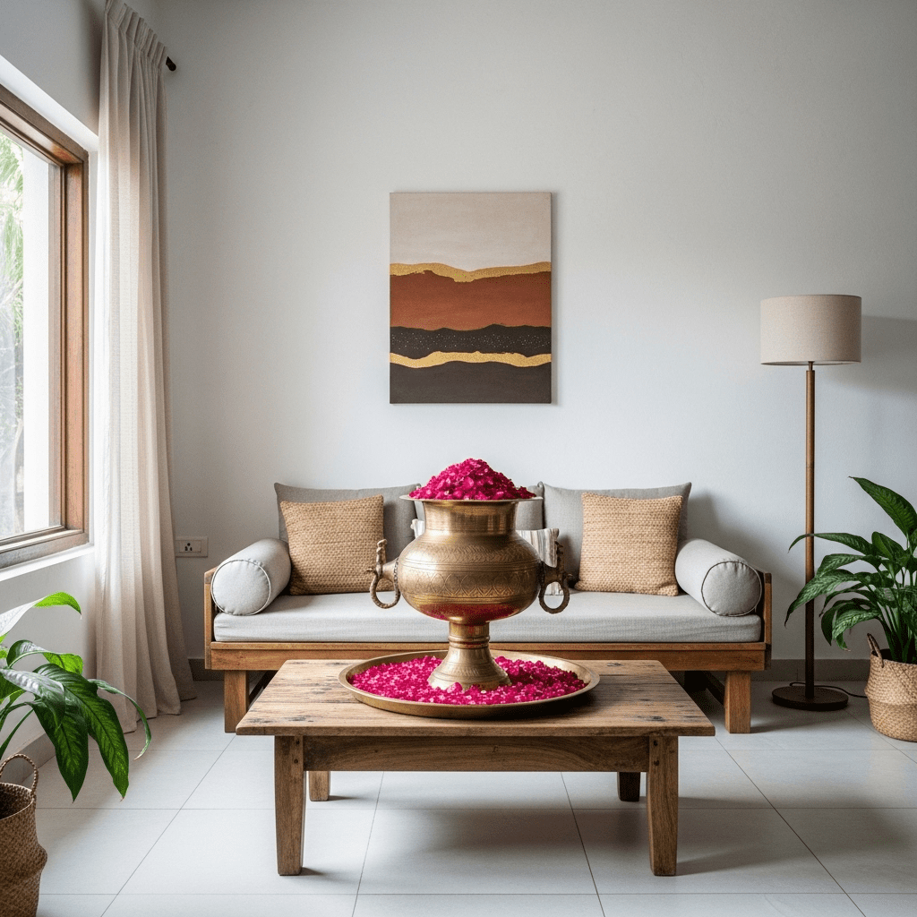 Incorporating traditional brass lamps (Diyas), large bronze vessels (Urli) filled with water and flowers, and metallic wall art for a touch of heritage.