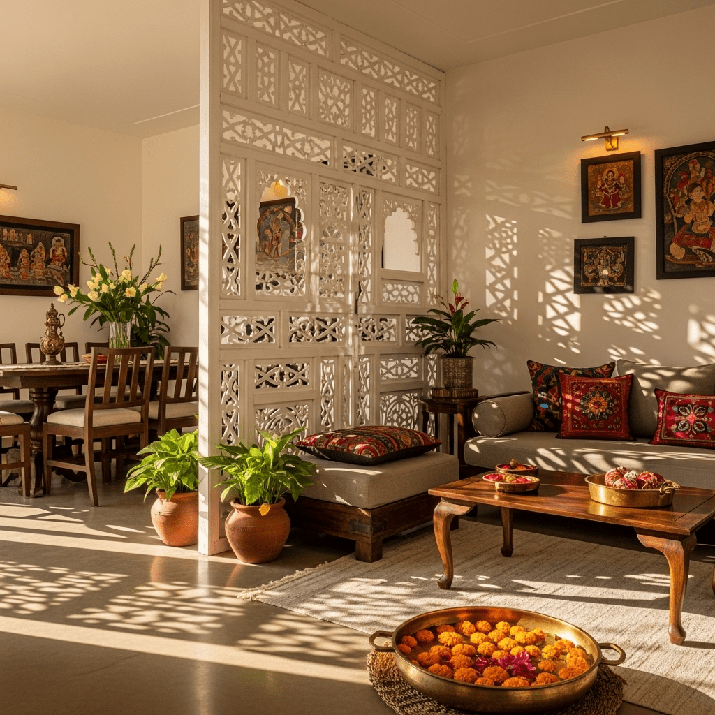 Using “Jali” (lattice) screens made of wood or CNC-cut metal to divide the living and dining areas without blocking light or airflow.