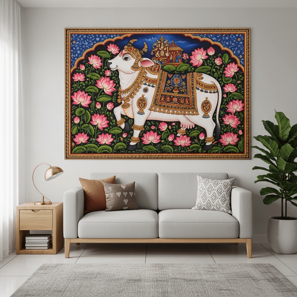 Using a single, large-scale piece of traditional Indian folk art—like a Pichwai painting of lotuses or Warli tribal art—as the room’s focal point.