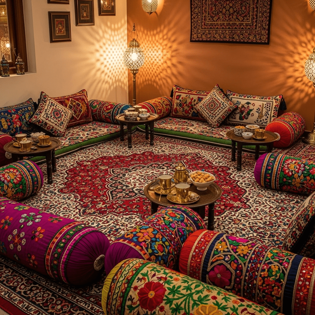A traditional “floor-seating” arrangement using high-quality mattresses, bolsters, and colorful covers. It’s perfect for casual gatherings and small spaces.