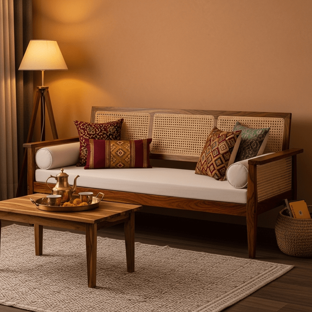 Combining heavy dark wood frames (like Sheesham) with light, breathable cane webbing. This mix is perfect for India’s tropical climate.