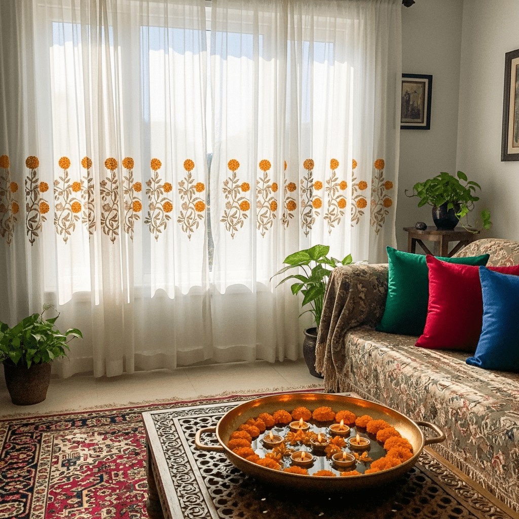 Integrating traditional Indian floral patterns (like marigold or lotus) into modern elements like rugs, wallpapers, or sheer curtains.