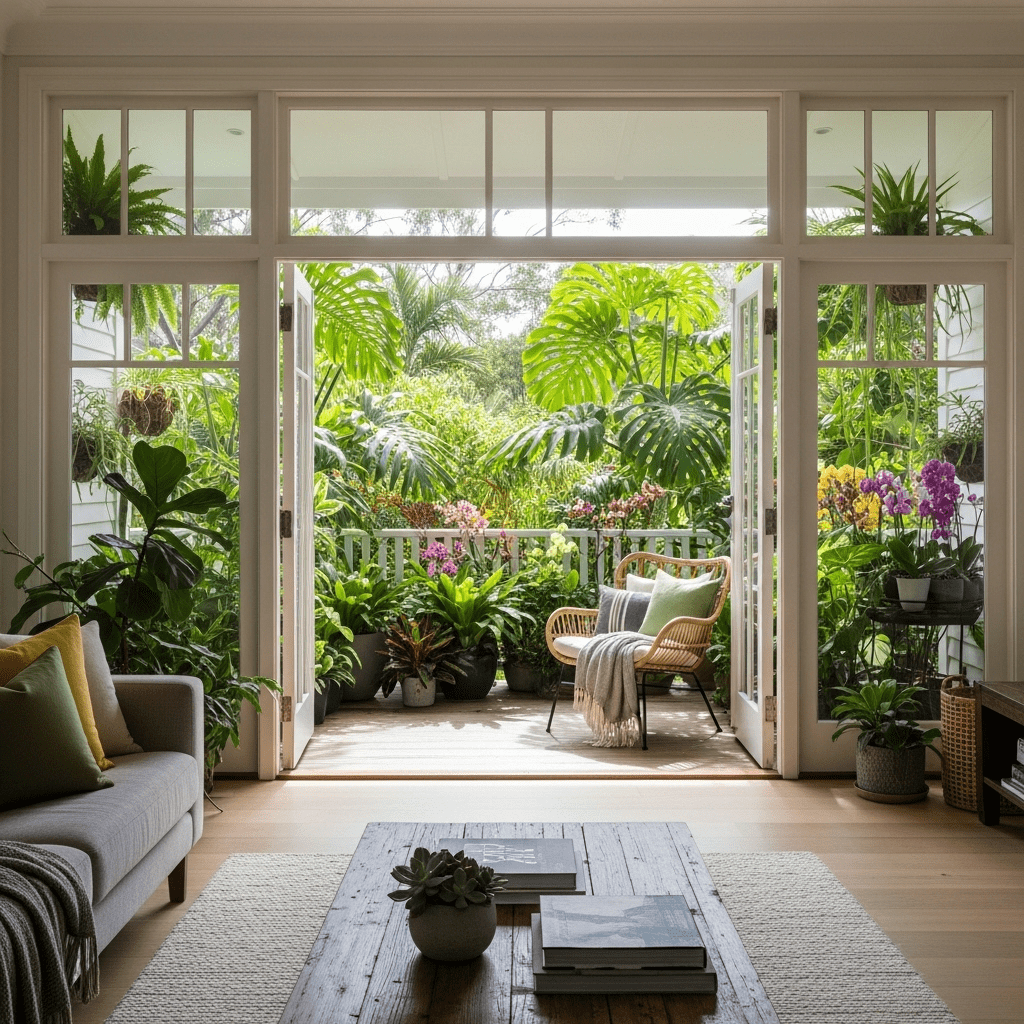 In warmer climates, the living room opens into a semi-outdoor veranda with potted palms, cane furniture, and hanging plants.