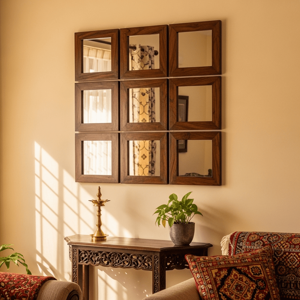 Using a series of “Thikri” (mirror inlay) or simple wooden-framed mirrors to create a sense of space and reflect the warm evening lamplight.
