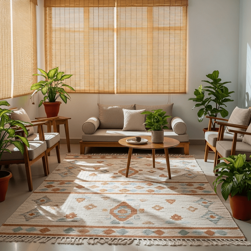 Focusing on natural, hand-woven textiles for curtains, rugs, and cushion covers. It celebrates India’s rich textile heritage while keeping the space breathable.