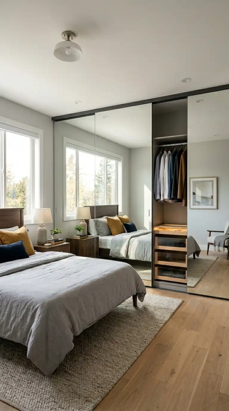 Floor-to-ceiling mirrored sliding doors are a classic choice for small or dark bedrooms. The reflective surfaces bounce light around the room, creating the illusion of more space and brightness. Full-height mirrors also serve as a convenient dressing mirror. Choose frameless panels for a seamless, modern look, or add slim metal frames for subtle definition. The interior can be customized with hanging rods, shelves, and drawers to suit your storage needs.
