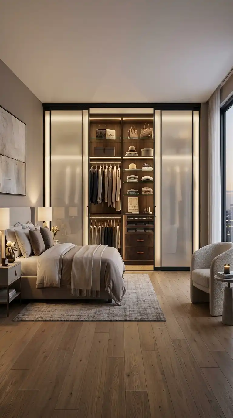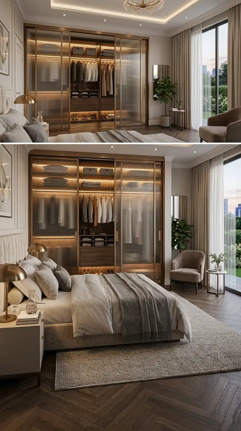 Glass-front sliding doors allow you to showcase your wardrobe while keeping it protected from dust. Frosted, tinted, or clear glass options offer varying levels of visibility. Incorporate internal LED lighting to illuminate the contents, creating a boutique-like display. This design works beautifully in master suites and walk-in closets where clothing and accessories become part of the room’s decor.