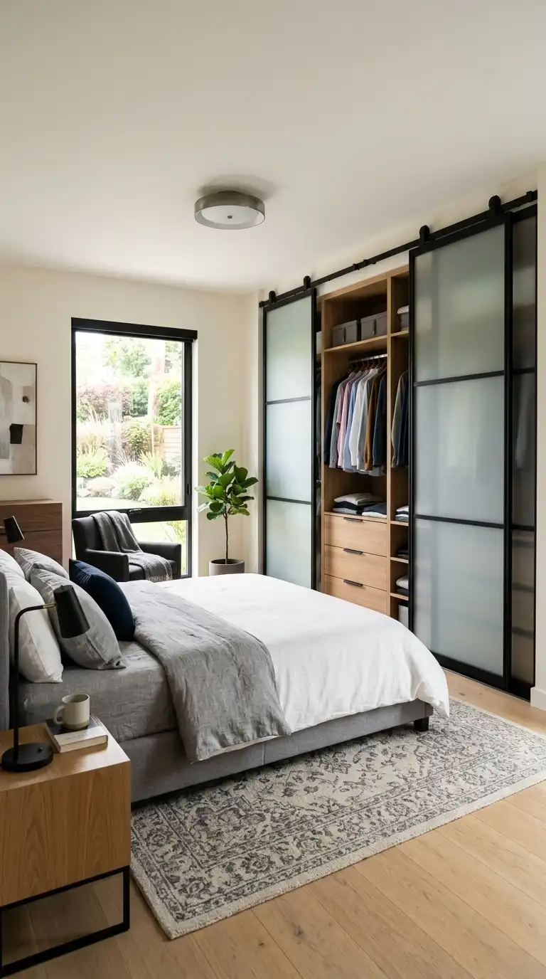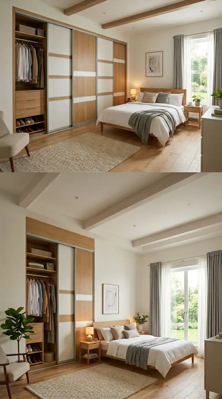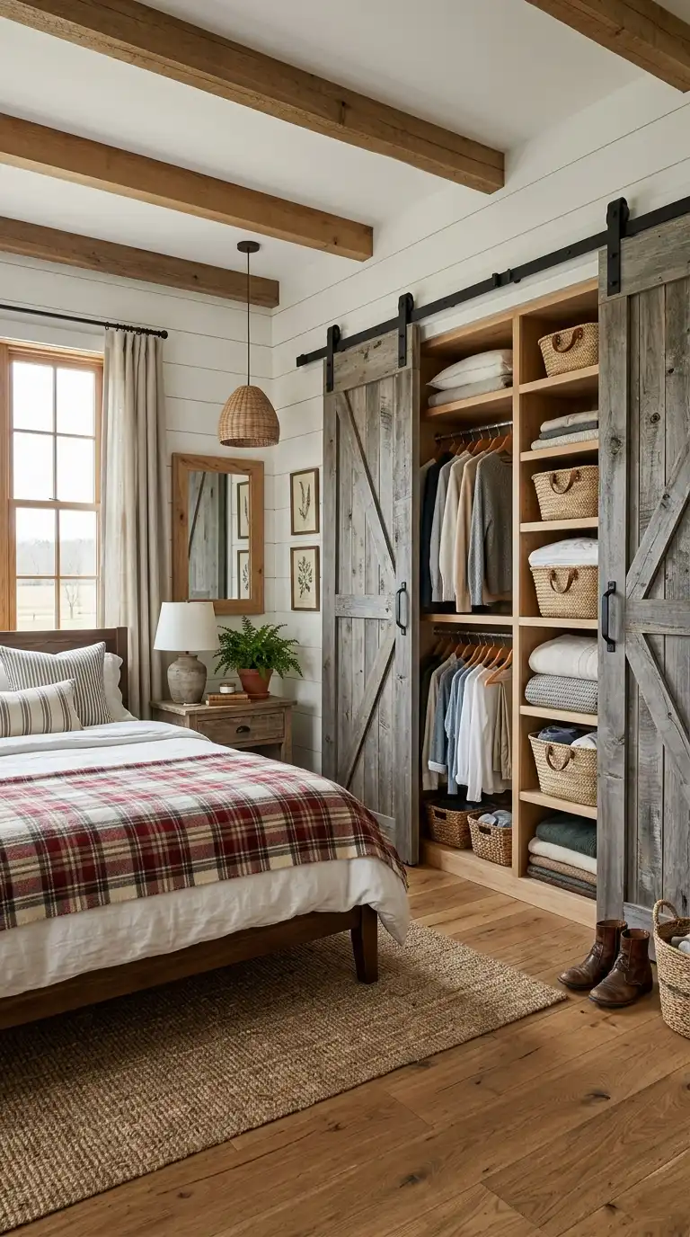 Sliding barn doors add rustic charm and farmhouse appeal to a bedroom wardrobe. The doors slide on an exposed metal track, making a design statement while saving space. Choose reclaimed wood, distressed finishes, or painted panels to suit your style. Pair with black iron hardware and natural textures like jute or linen for a cozy, inviting aesthetic.