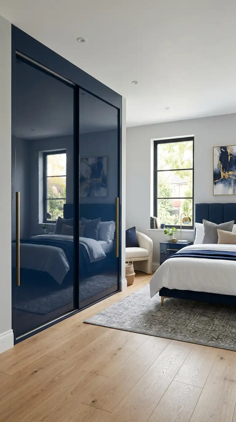 High-gloss lacquer finishes add a sleek, reflective surface that brings a touch of glamour to modern bedrooms. Available in bold colors like navy, emerald, or charcoal, as well as classic white and black, high-gloss panels create a polished, sophisticated look. The glossy surface reflects light, making the room feel brighter and more spacious. Pair with minimalist hardware or opt for push-to-open mechanisms.