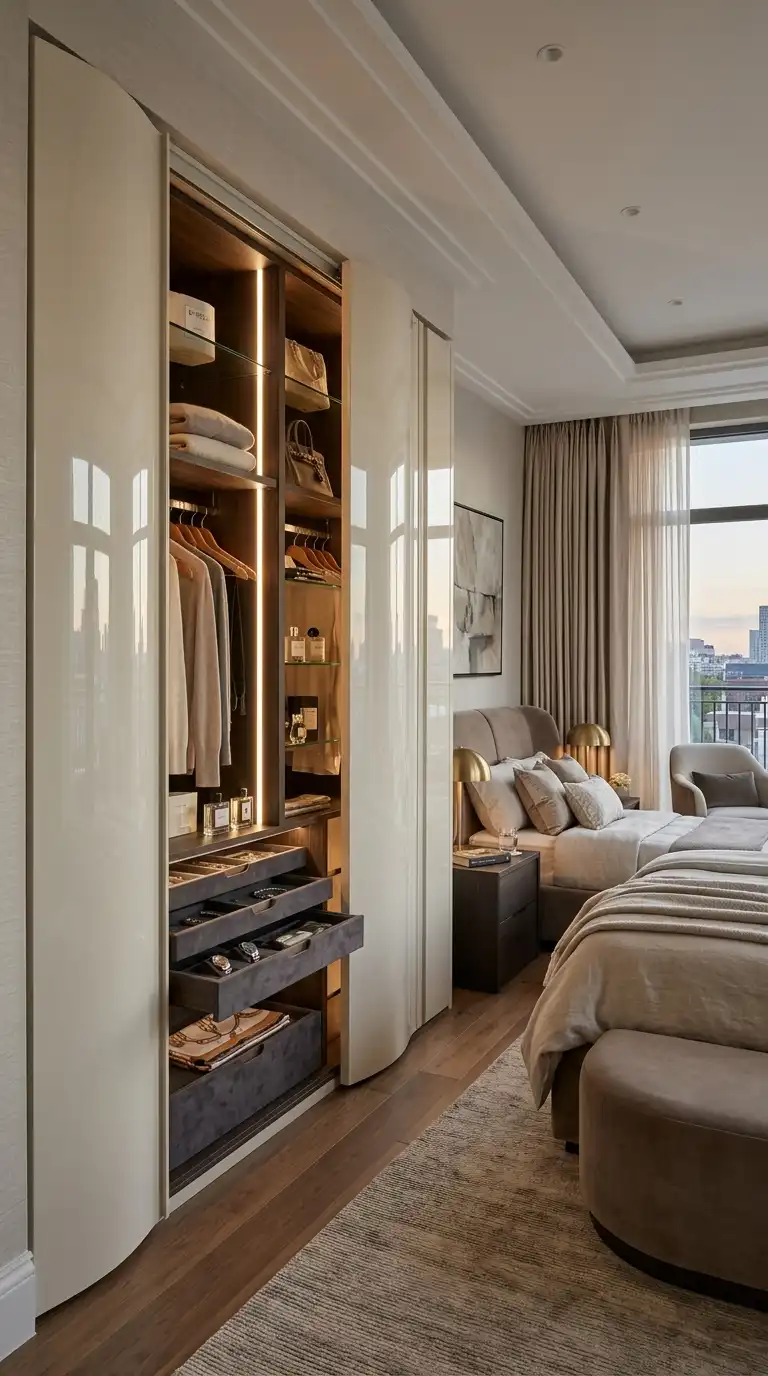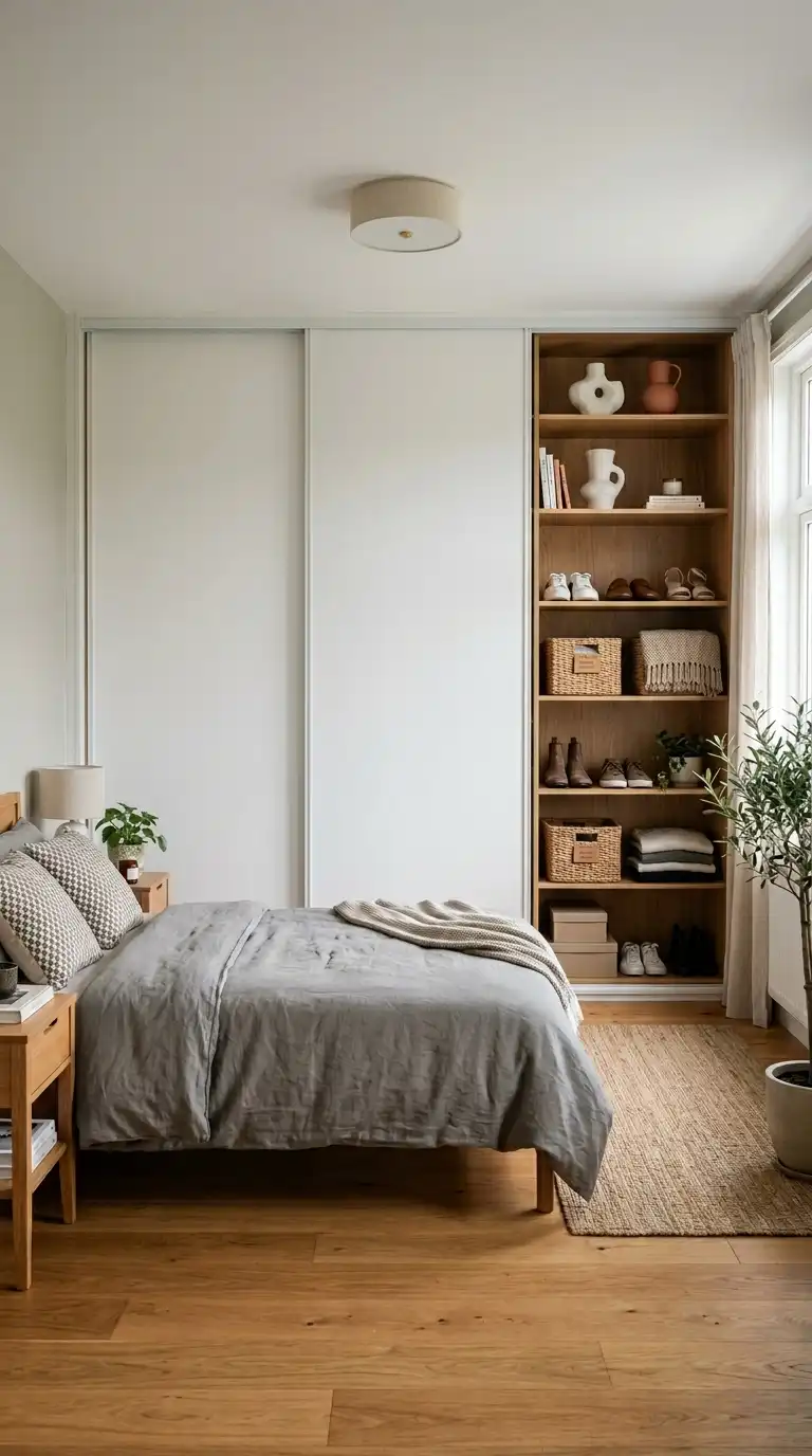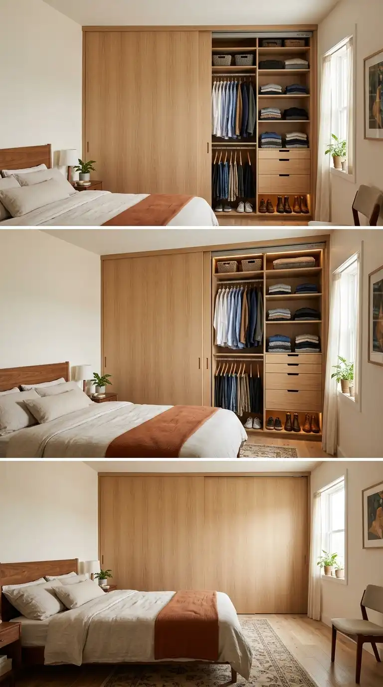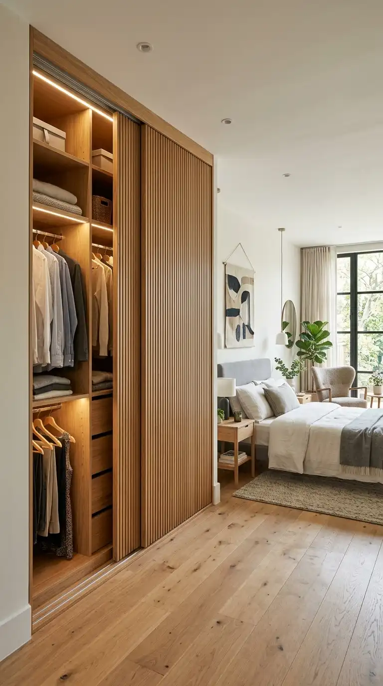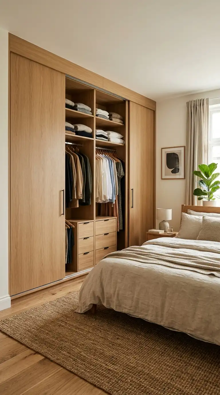 Combine closed sliding doors with an open shelving section for a wardrobe that balances display with concealment. Use the open shelves to showcase shoes, bags, or decorative boxes, while the closed sections hide everyday clothing. This design adds visual interest and allows you to personalize the space with curated items. The open section can be illuminated with LED strips for added drama.