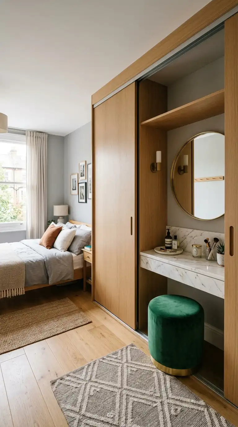 Incorporate a vanity or dressing table into your sliding wardrobe design for a space-saving, cohesive solution. The vanity can be positioned at one end of the unit, with a mirror, stool, and dedicated storage for makeup and accessories. When not in use, a sliding door can conceal the vanity for a clean, uncluttered look. This design is ideal for compact bedrooms where a separate dressing area is not feasible.