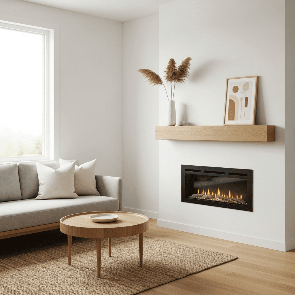 Use a thick, reclaimed wood floating mantel instead of a full traditional surround. This reduces the visual “weight” of the fireplace, making the wall feel more open.