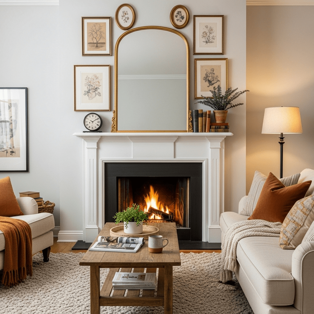 Place a large, arched mirror directly above the mantel. The mirror reflects the rest of the room, effectively “doubling” the perceived space and light.