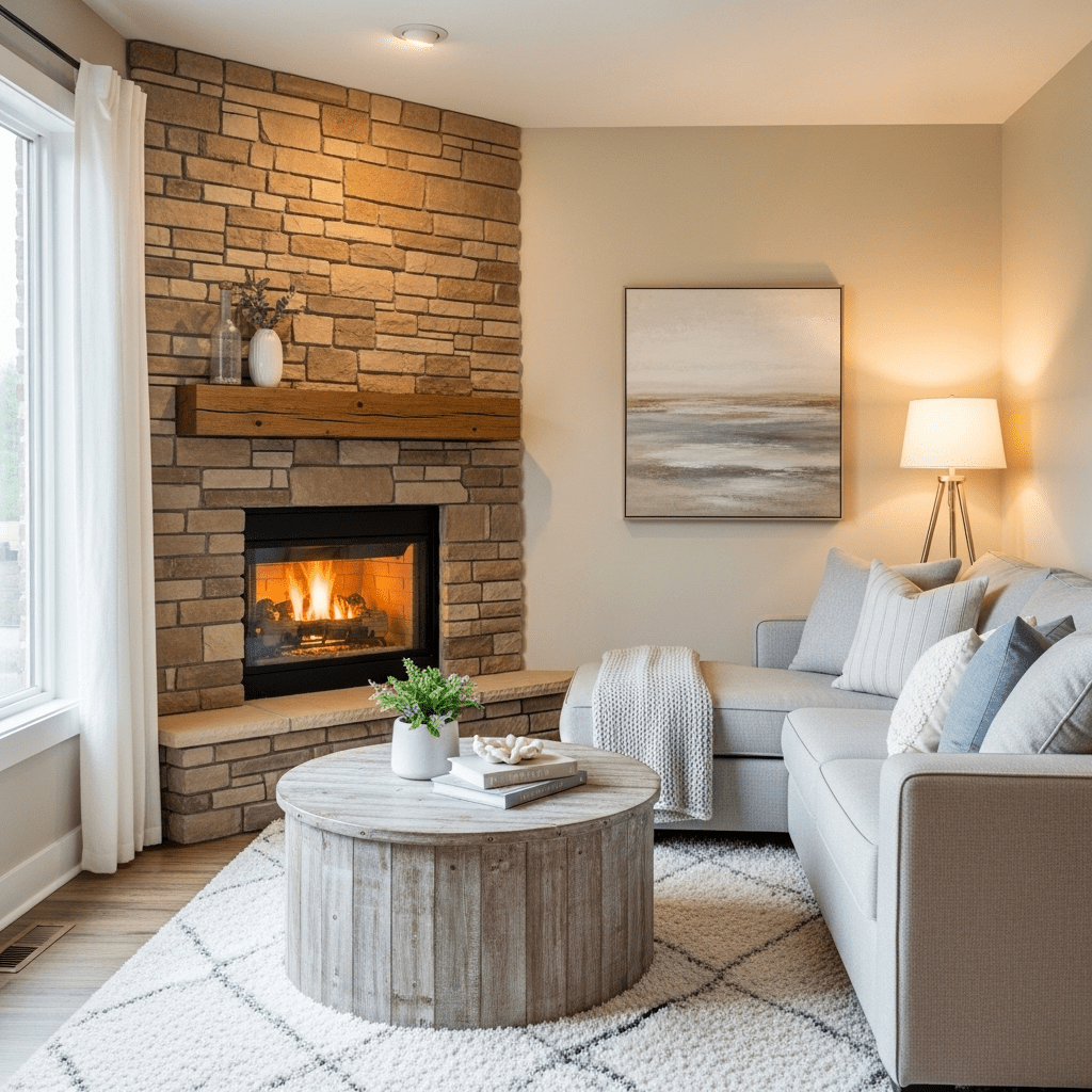 If the fireplace is in a corner, use a small-scale L-shaped sectional that faces it diagonally. This maximizes seating while respecting the unique flow of a corner focal point.