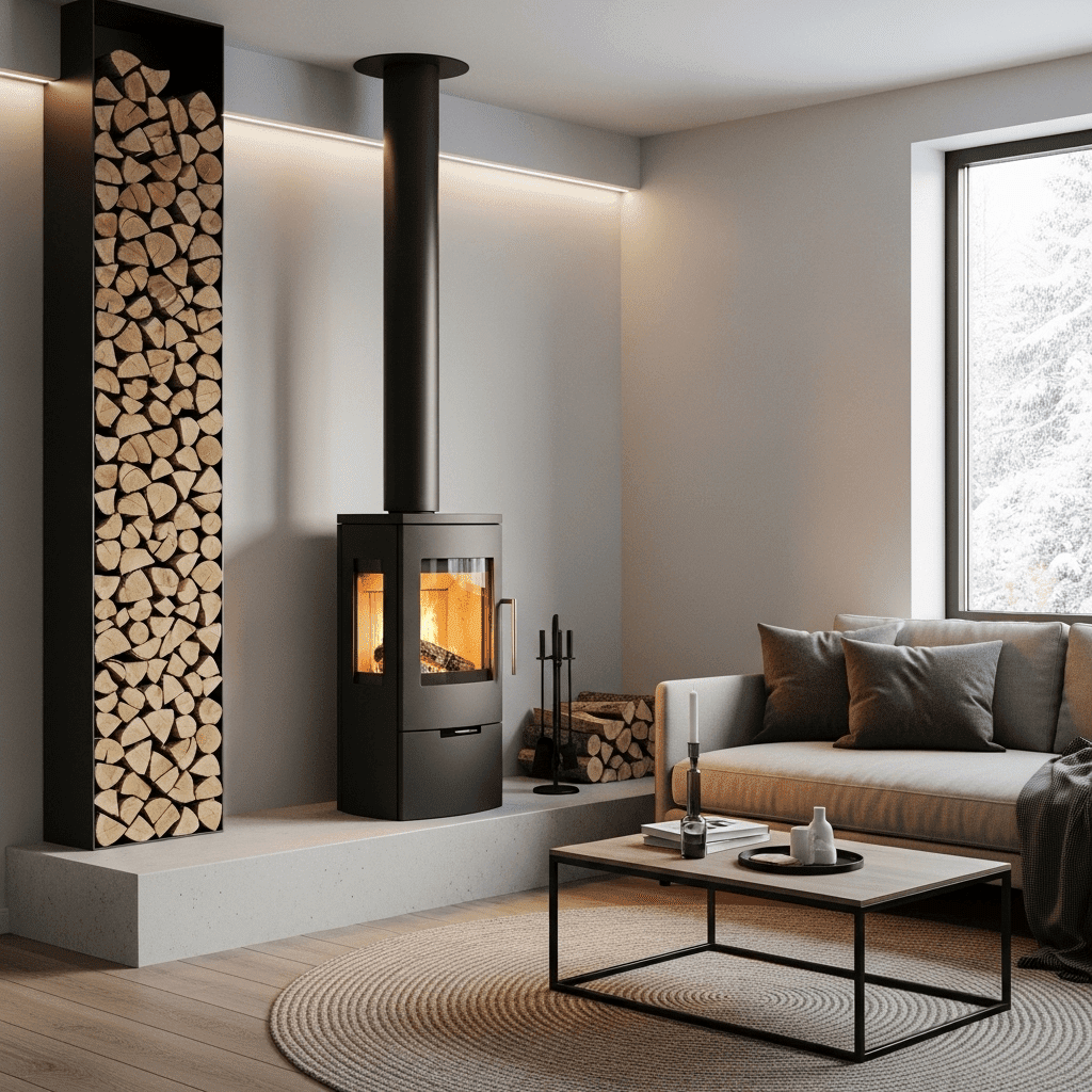Use the alcoves next to the fireplace to stack firewood vertically. The natural wood texture adds warmth and an organic element that doubles as rustic art.