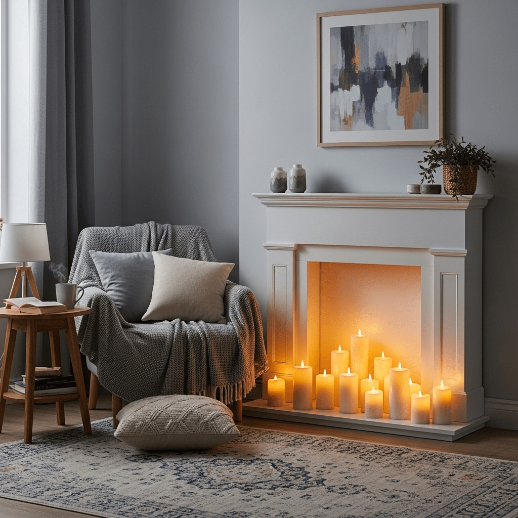 If your fireplace is decorative or non-functional, fill the interior with large white candles or a stack of vintage books. It creates a cozy vibe without the need for ventilation.