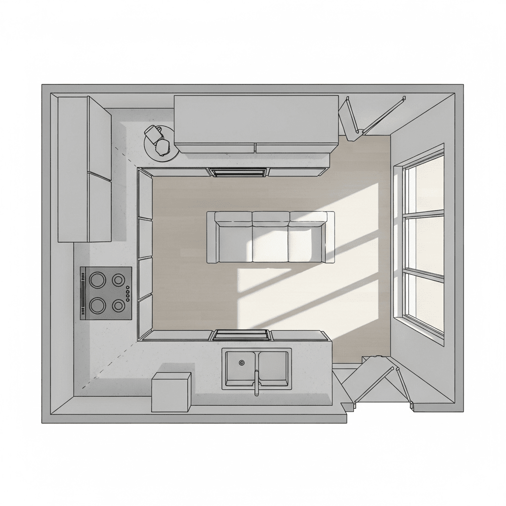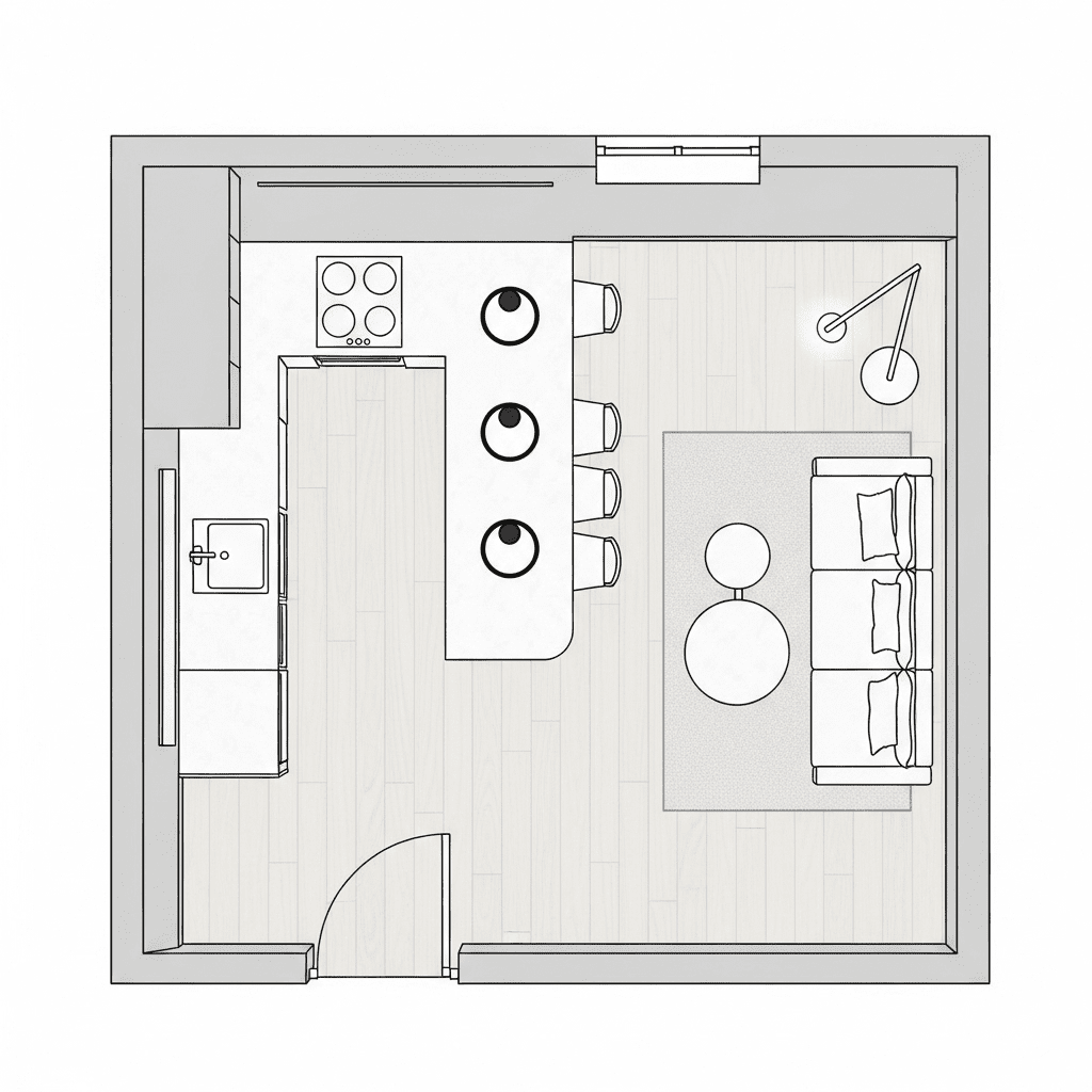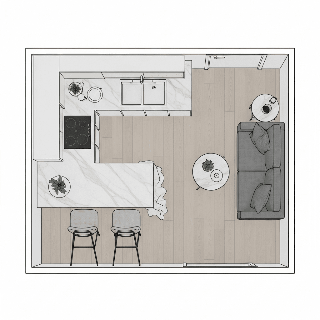 A kitchen peninsula provides essential counter space while acting as a physical but low-profile barrier between the cooking and lounging areas. It keeps the room open while clearly defining where the kitchen ends.