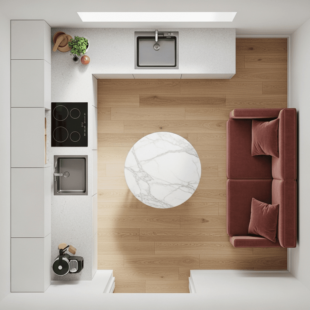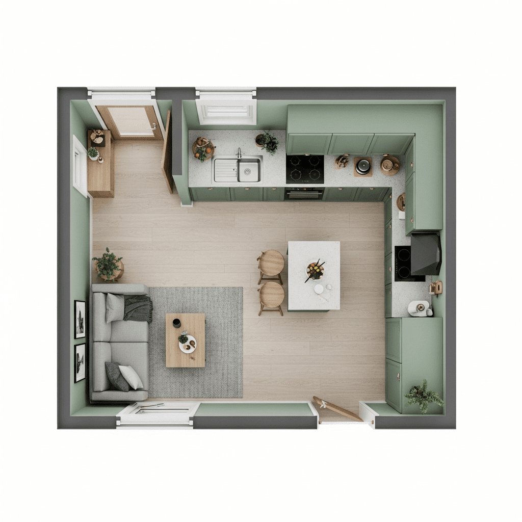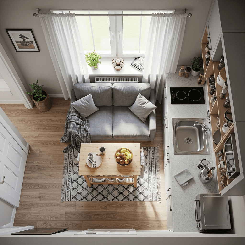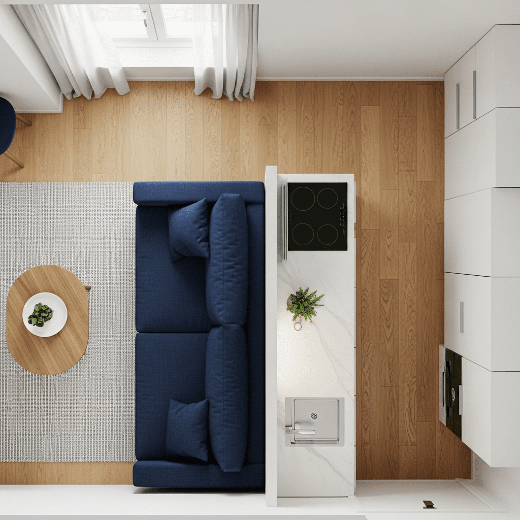 Paint the kitchen cabinets the exact same color as the living room walls. This makes the kitchen “disappear” into the architecture, reducing the visual weight of the cooking area.