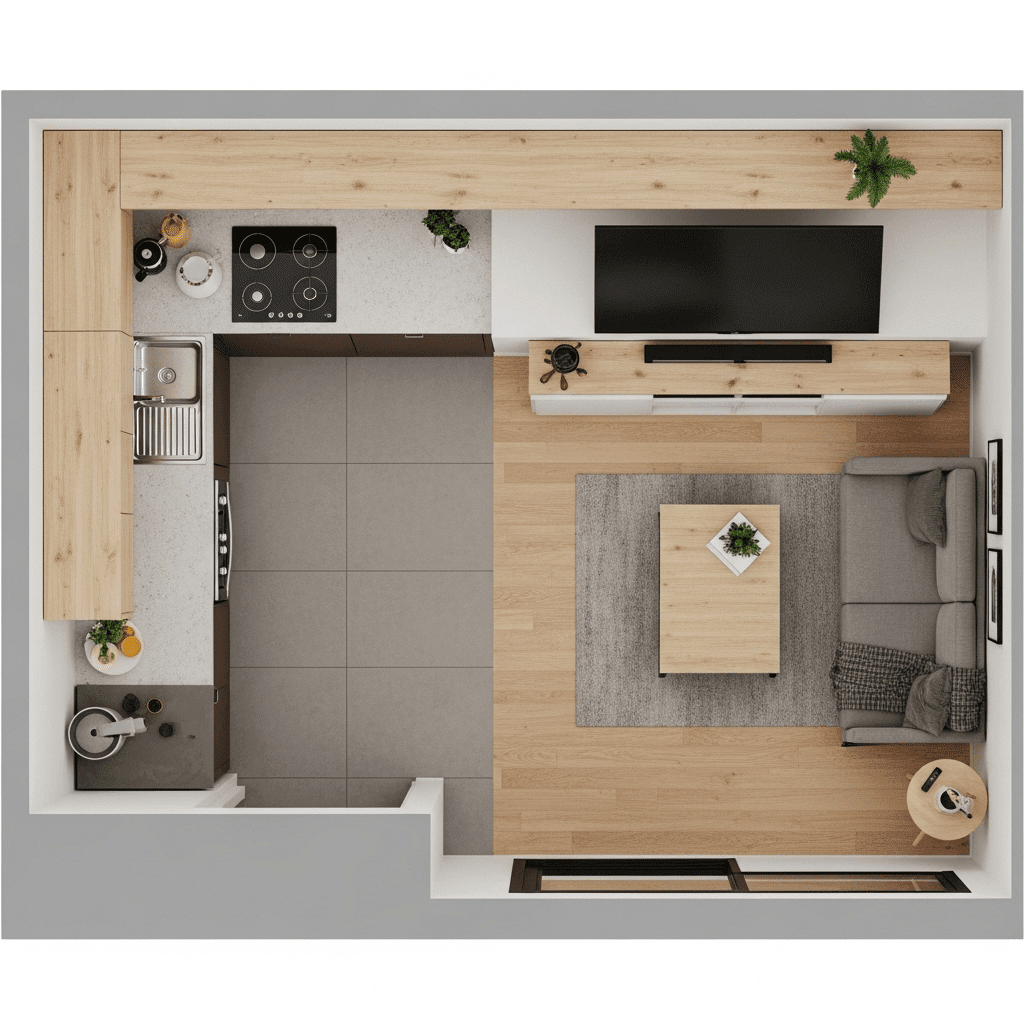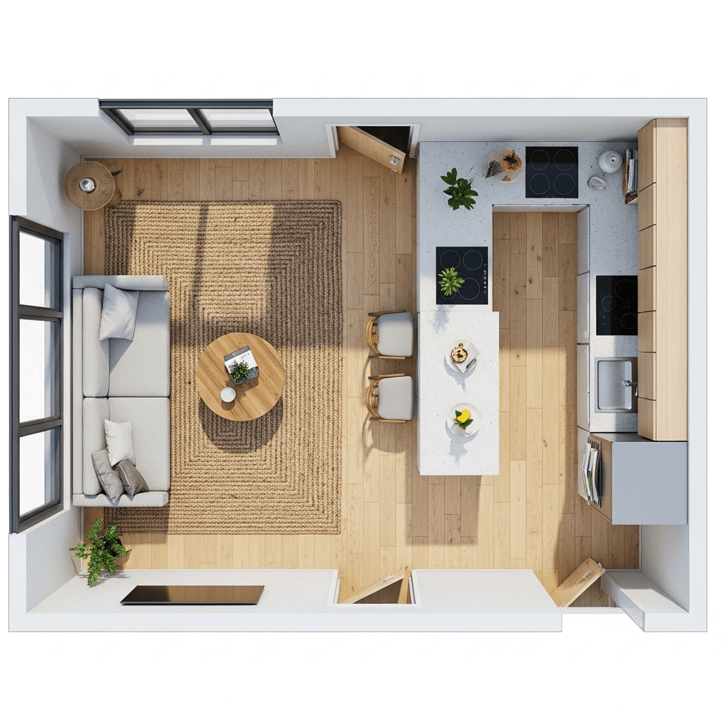 Define the living room as its own “island” by placing a large, textured rug under the seating area. This visual anchor distinguishes the lounge from the hard-surface kitchen area.