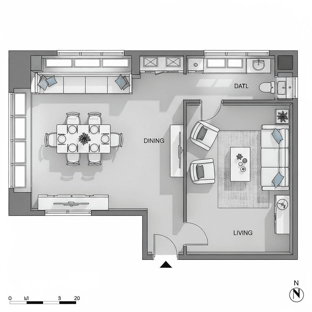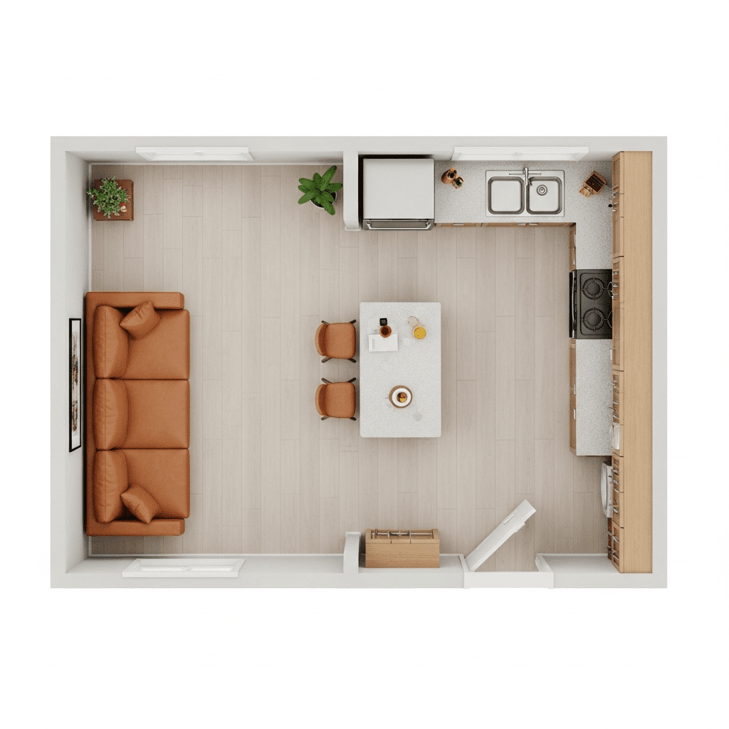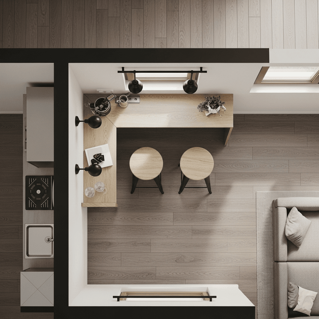 Hang dramatic pendant lights over the kitchen counter but use soft, low-profile lamps in the living room. Different light levels create “invisible rooms” without needing walls.