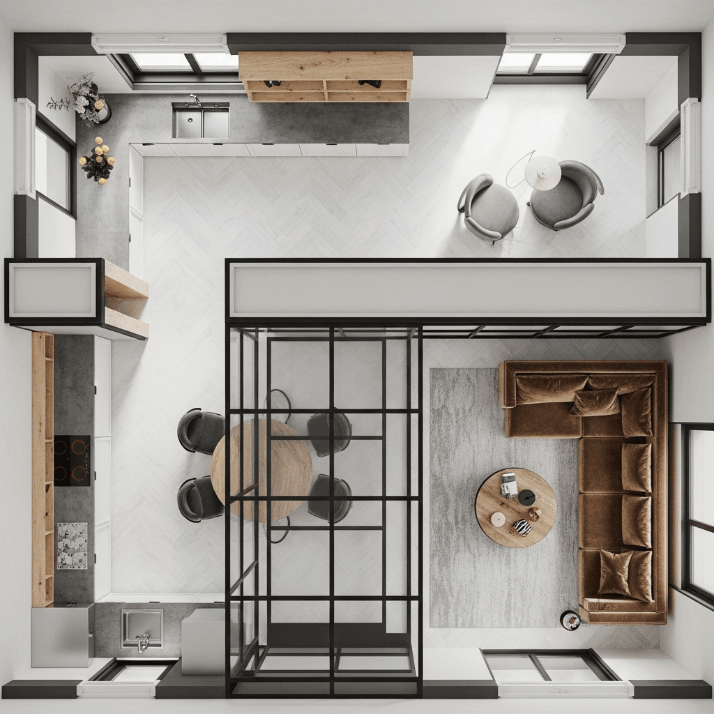 If you need to block cooking smells or noise, use a slim black-framed glass partition. It provides an industrial-modern look that defines the rooms while keeping them visually connected.