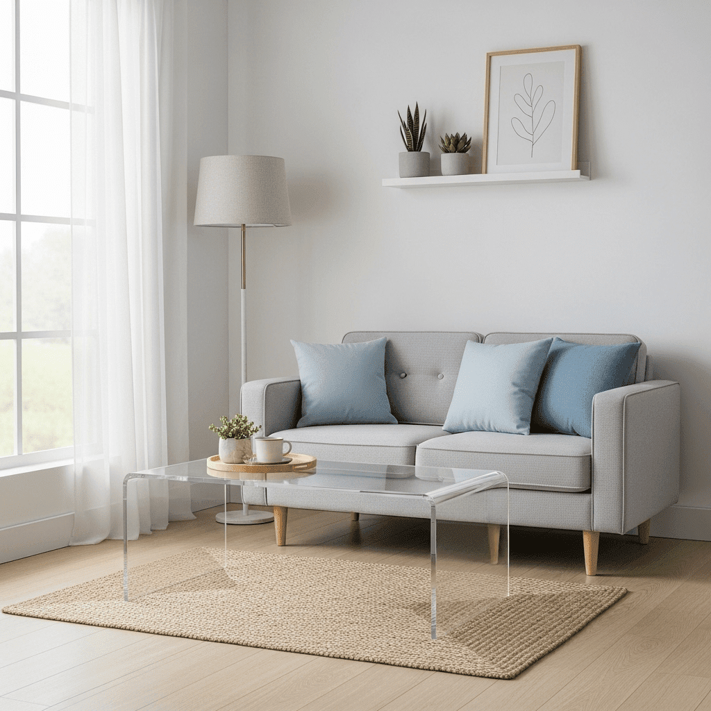 Use a clear acrylic or glass coffee table to maintain an open line of sight. Because the furniture is transparent, the eye perceives the floor area as unoccupied, which prevents the center of the room from feeling “blocked.”