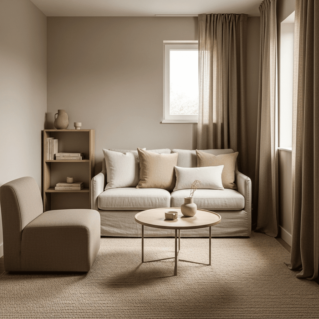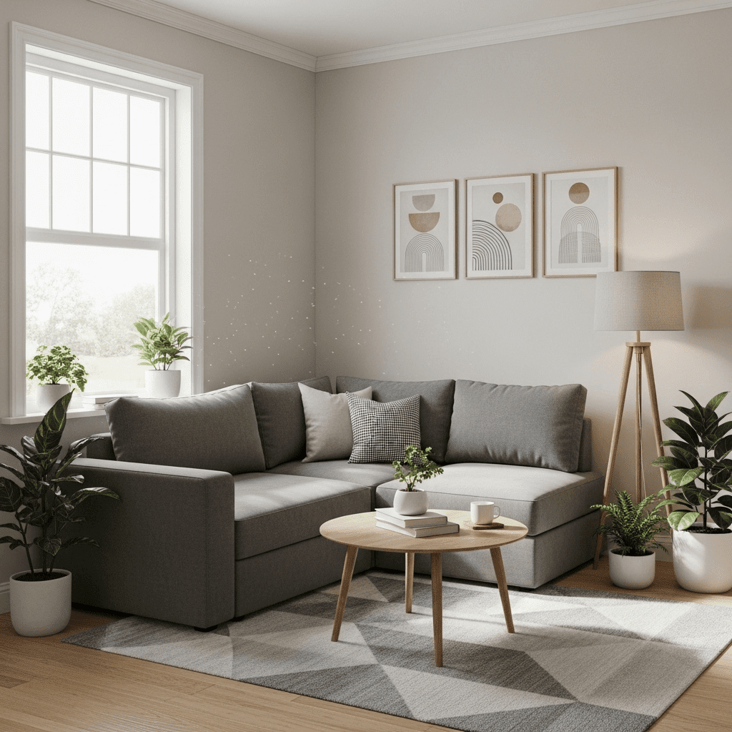 Tuck a small-scale sectional sofa into the far corner of the room. This uses the most efficient seating geometry, leaving the rest of the floor open for a walkway or a small accent rug.