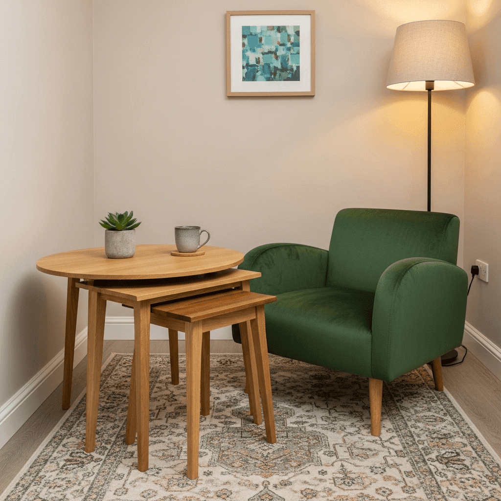 Choose a set of nesting tables that can be stacked when not in use. This provides flexible surface area for guests while maintaining a single, small footprint for daily life.