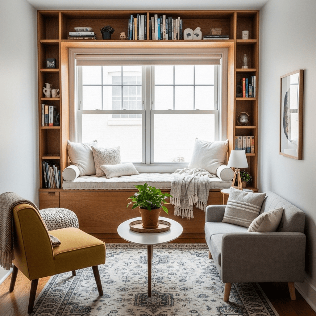 Convert a window ledge into a built-in bench with storage underneath. This utilizes the “dead space” under the window for extra seating and hides clutter away from view.