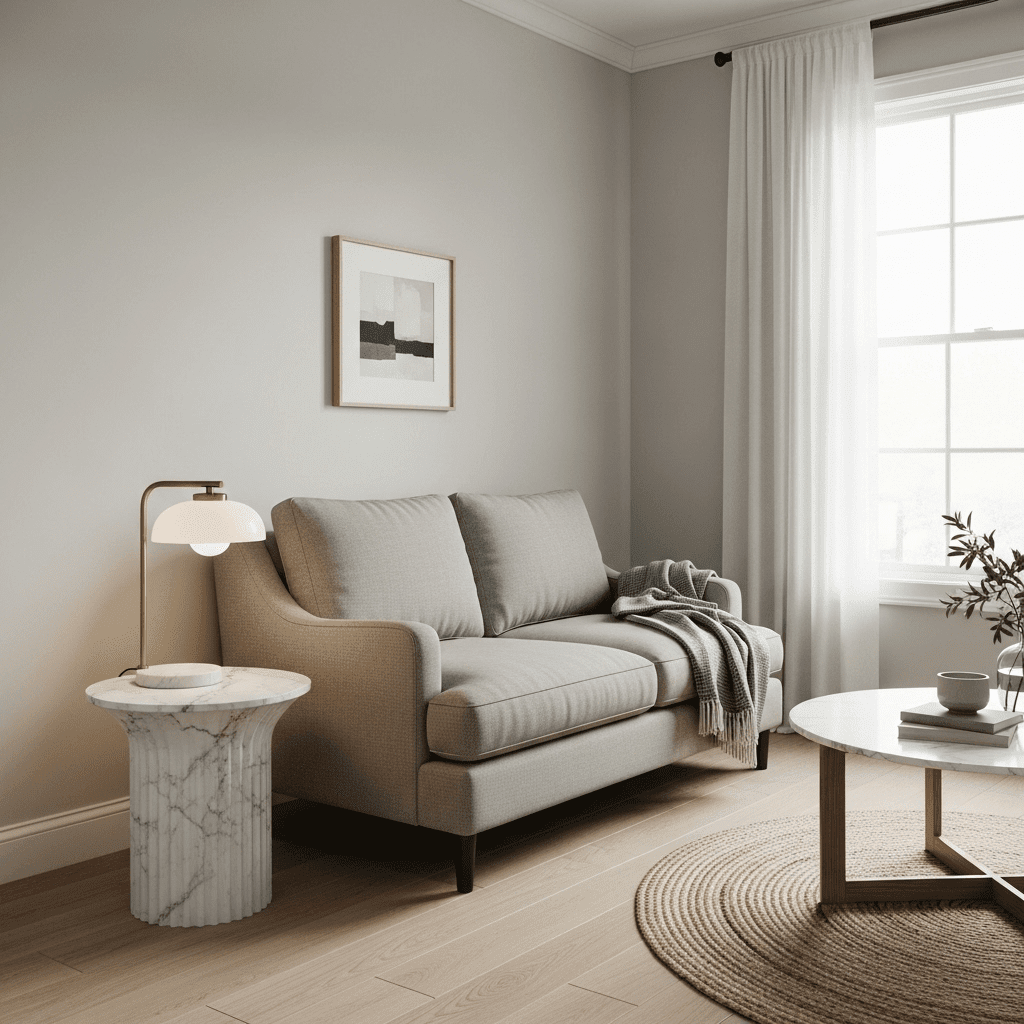 Incorporate a C-shaped table that slides its base under the sofa. This provides a stable surface for a laptop or coffee without requiring a permanent footprint in the middle of the room.