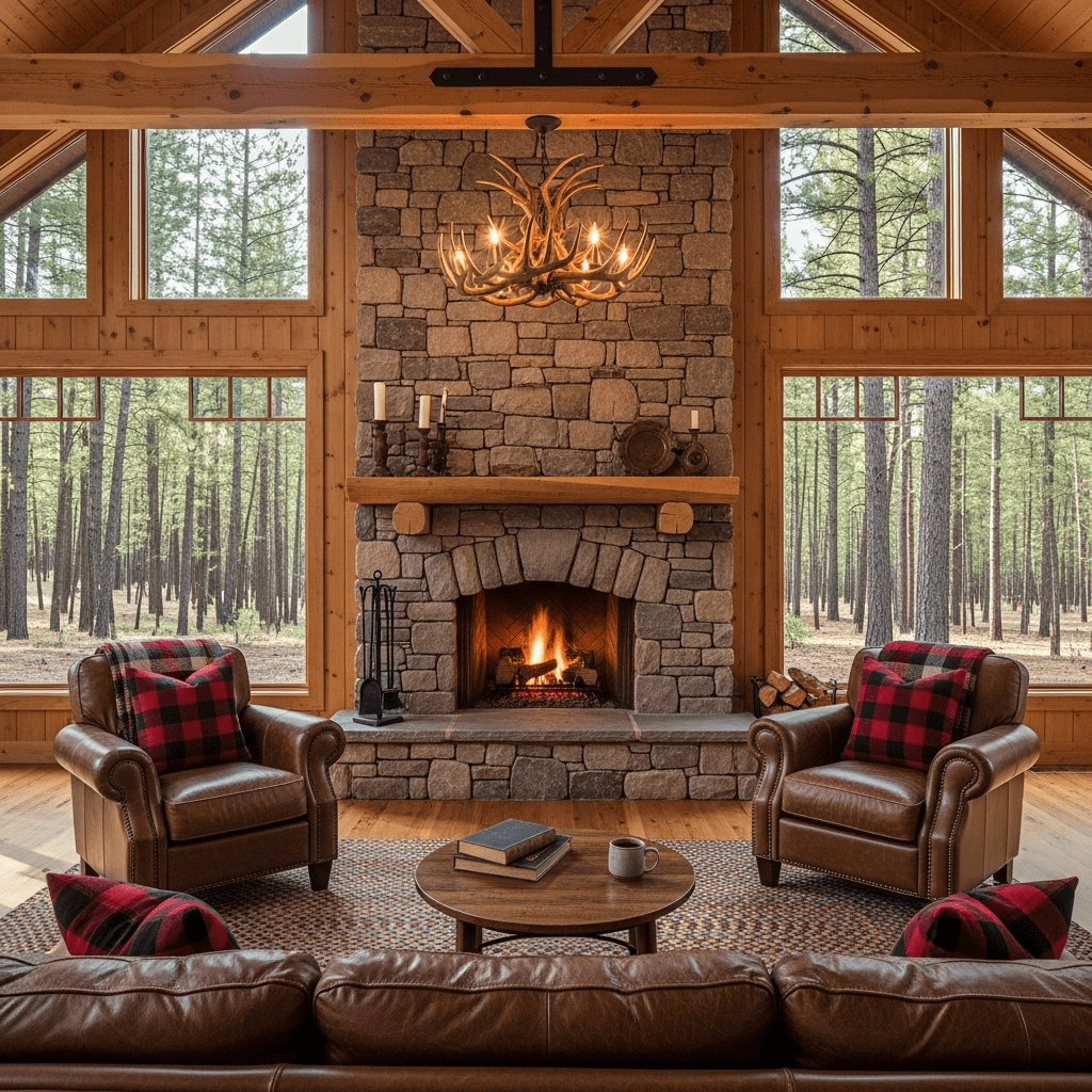 Channel mountain lodge vibes with exposed wooden beams, stone fireplace, and leather furniture. Deep brown and forest green accents complement the natural materials, while a large area rug grounds the space. This style works beautifully for those who love the outdoors.
