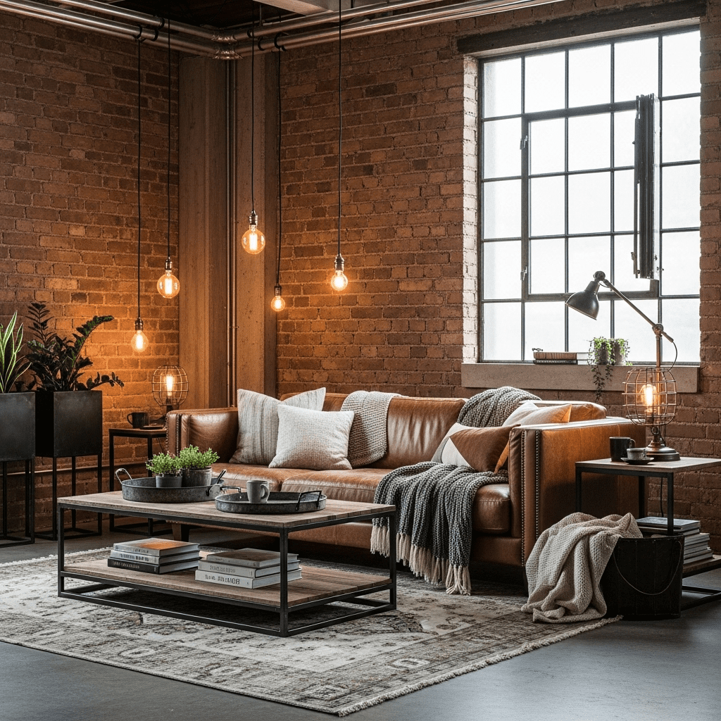 Soften industrial elements like exposed brick, metal fixtures, and concrete with warm textiles and ambient lighting. Leather furniture and vintage pieces add character while maintaining that urban edge.