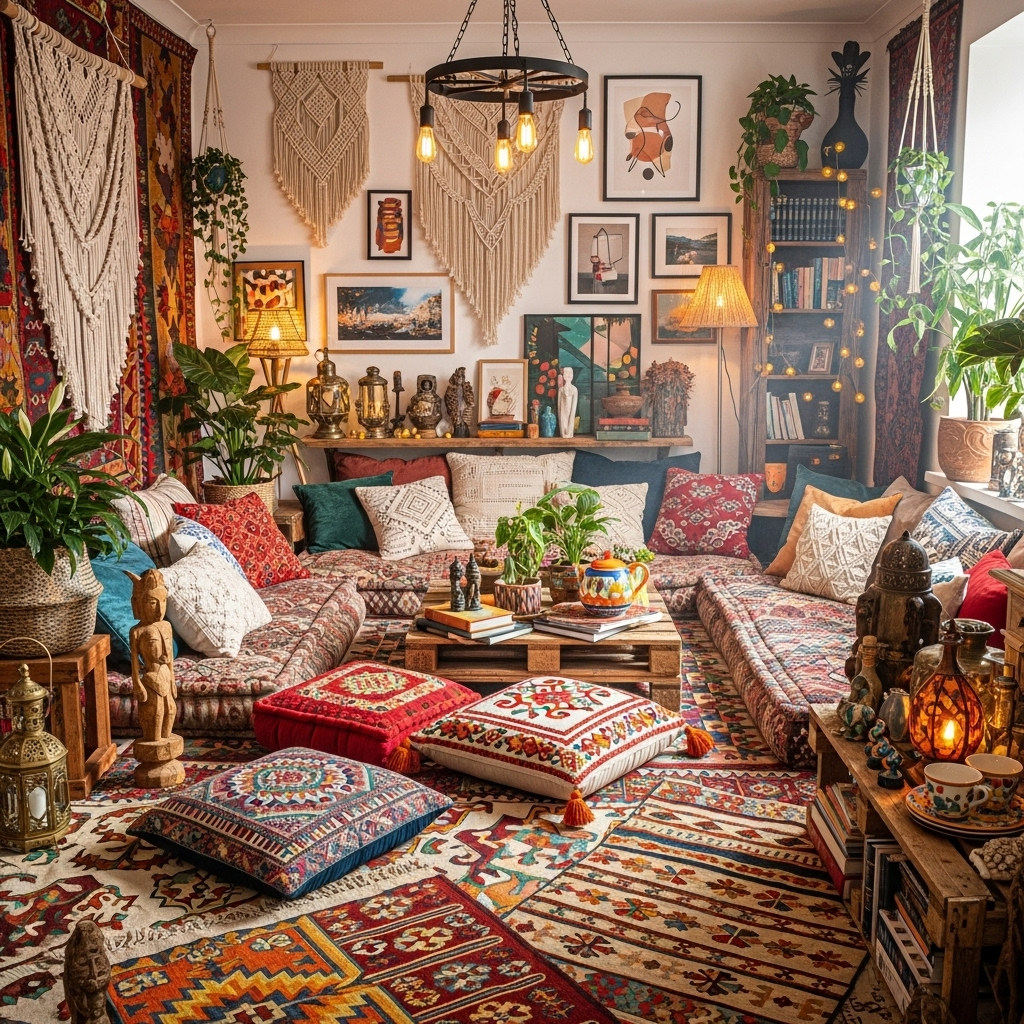 Layer patterns, colors, and textures freely in a bohemian-inspired space. Floor cushions, macramé wall hangings, and an eclectic mix of furniture create a relaxed, worldly atmosphere that encourages lounging.