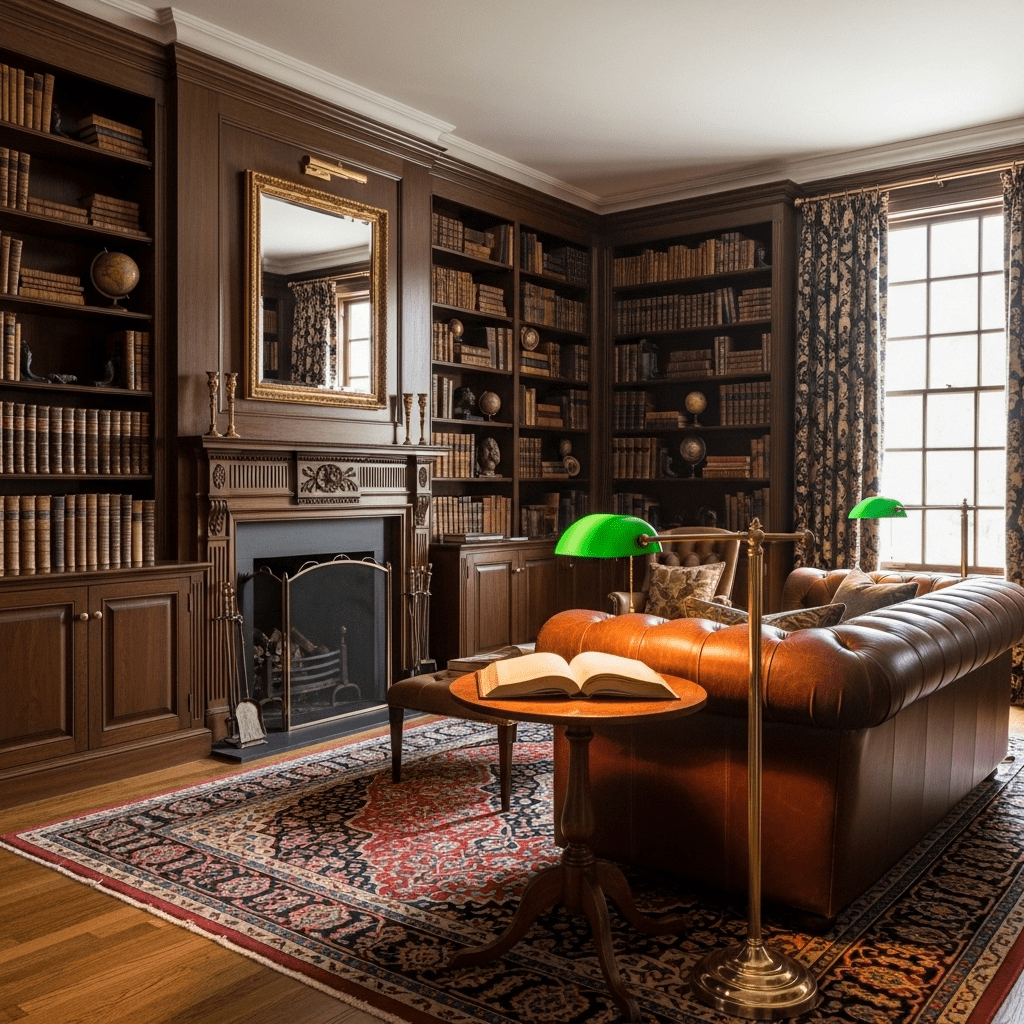 Dark wood paneling, built-in bookshelves, and a tufted leather sofa create the ultimate reading retreat. Add a brass floor lamp and Persian rug for timeless sophistication.