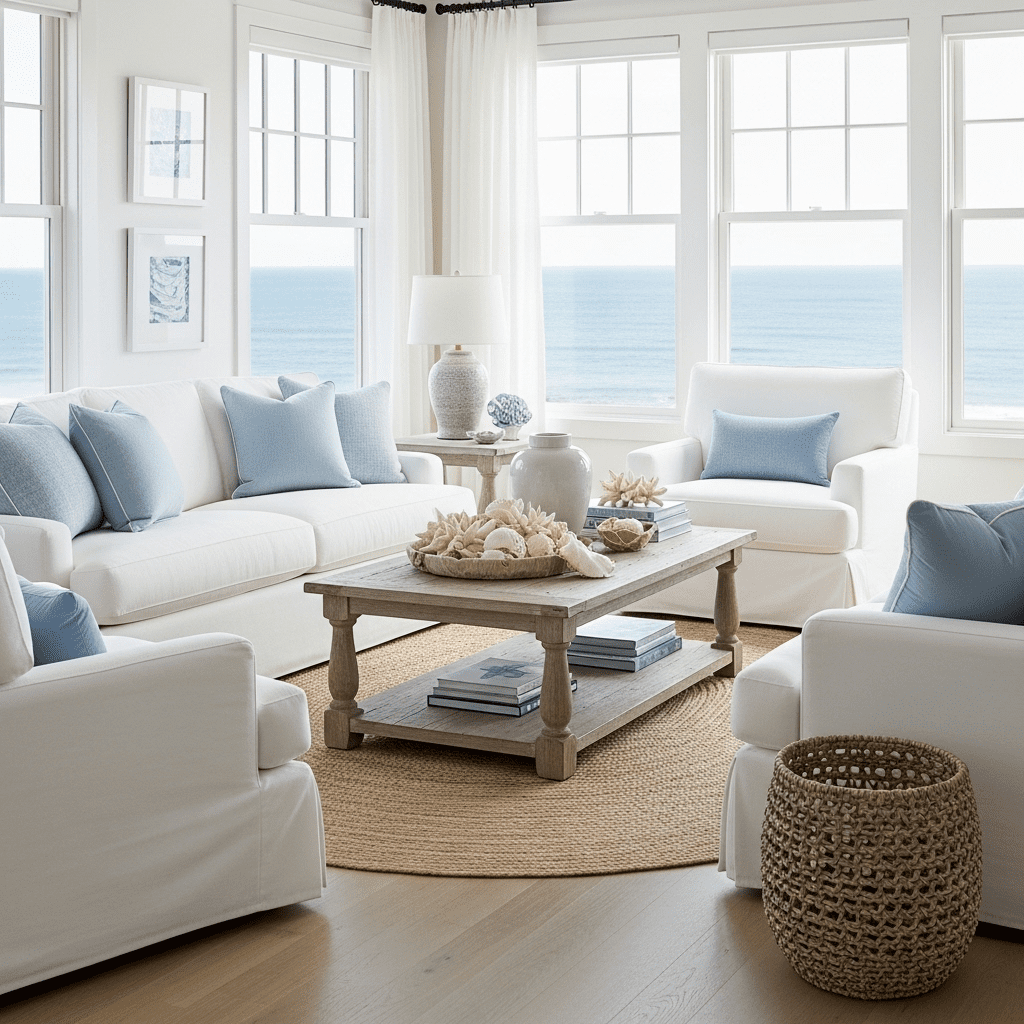 Bring beachy warmth inside with weathered wood, soft blues, and natural textures. White slipcovered furniture and nautical accents create a relaxed coastal vibe that feels like a permanent vacation.