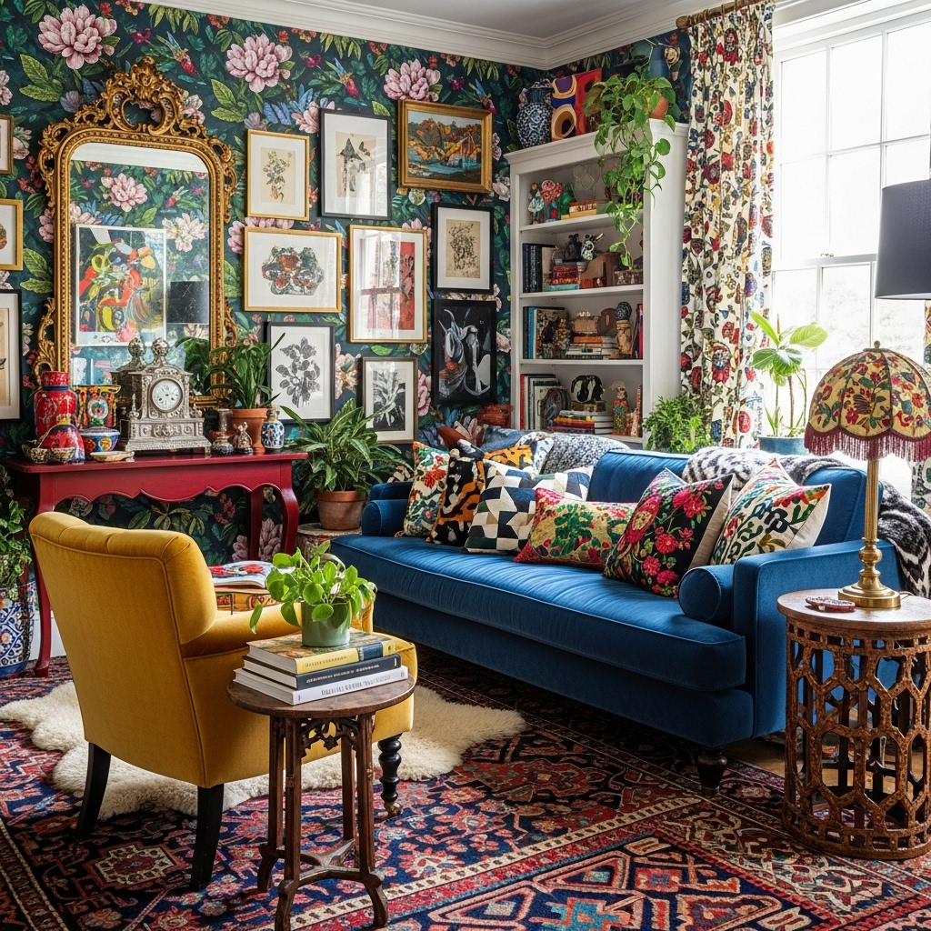 Embrace abundance with rich colors, pattern mixing, and curated collections. Layered art, vintage finds, and luxurious fabrics create a space that tells your story while feeling incredibly inviting.